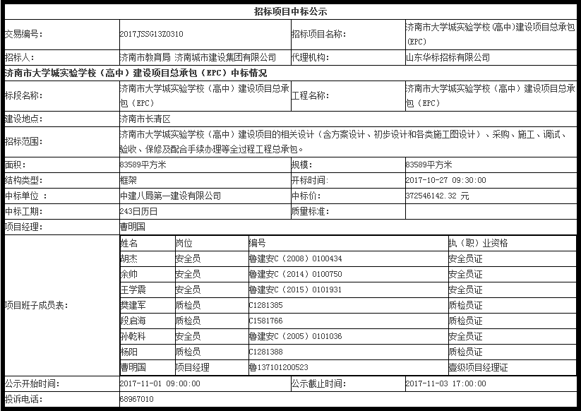 濟(jì)南市大學(xué)城實(shí)驗(yàn)學(xué)校(高中)建設(shè)項(xiàng)目總承包(EPC)中標(biāo)公示