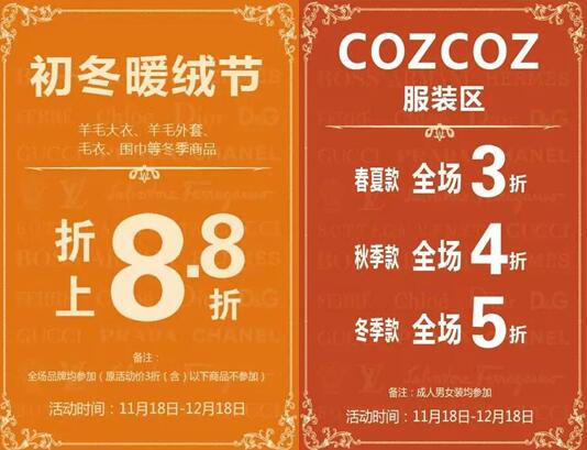 11月18日—12月18日推出“初冬暖絨節”活動,羊毛大衣、羊毛外套、毛衣、圍巾等冬季商品折上8.8折優惠,cozcoz服裝區3~5折優惠進行中。