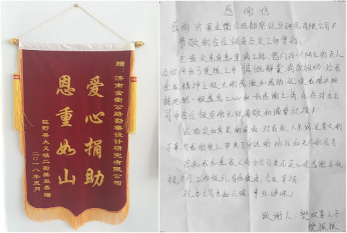 5月24日,菏澤市巨野縣大義鎮(zhèn)二街樊雙喜委托家人專(zhuān)程來(lái)到濟(jì)南金衢公路勘察設(shè)計(jì)研究有限公司,將一面寫(xiě)有“愛(ài)心捐助 恩重如山”的錦旗和一封感謝信送到公司工作人員手中,借此表達(dá)對(duì)濟(jì)南金衢公司全體員工對(duì)樊雙喜一家及時(shí)伸出援助之手、慷慨解囊渡難關(guān)的感激之情。