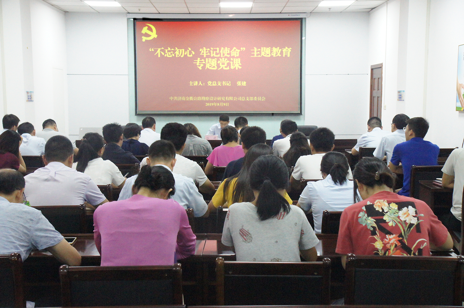 為深入推進“不忘初心 牢記使命”主題教育,不斷加強黨員干部教育管理,8月9日,濟南金衢公司黨支部開展主題教育專題黨課活動,全體黨員、中層以上管理干部、入黨積極分子。公司黨總支書記張建以“新常態(tài)下如何立足崗位以實踐行動詮釋實干、擔當”為題,為全體參加人員上了一堂內(nèi)涵豐富、意義深遠的黨課。