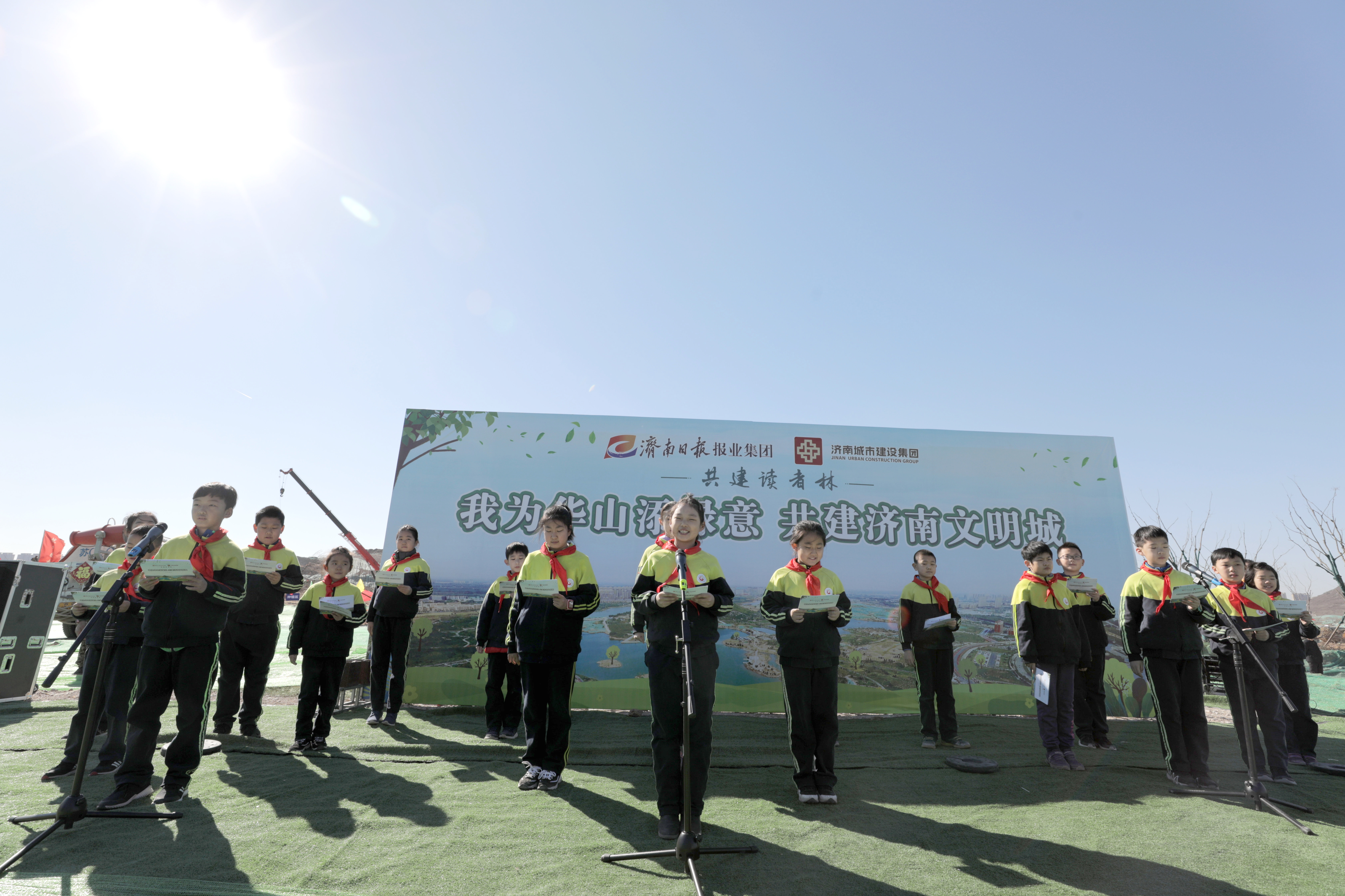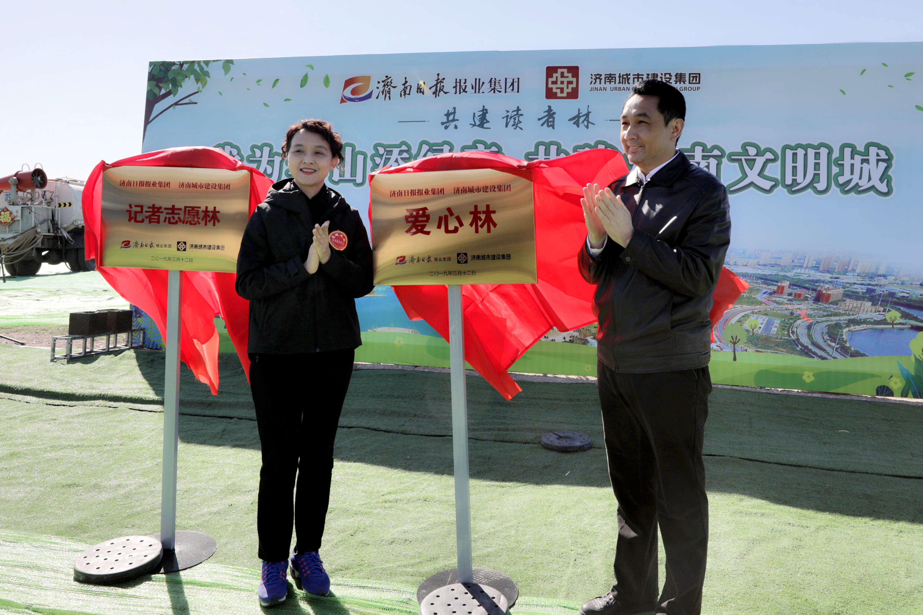 在華山歷史文化濕地公園內,來自雙方單位的干部職工、泉城義工、小記者代表等共計近500人春種華山,并在華山設立“記者志愿林”和“愛心林”。濟南城市建設集團黨委書記、董事長李國祥,濟南日報報業集團董事長、黨委書記、濟南日報社社長馬利共同為“記者志愿林”和“愛心林”揭牌。