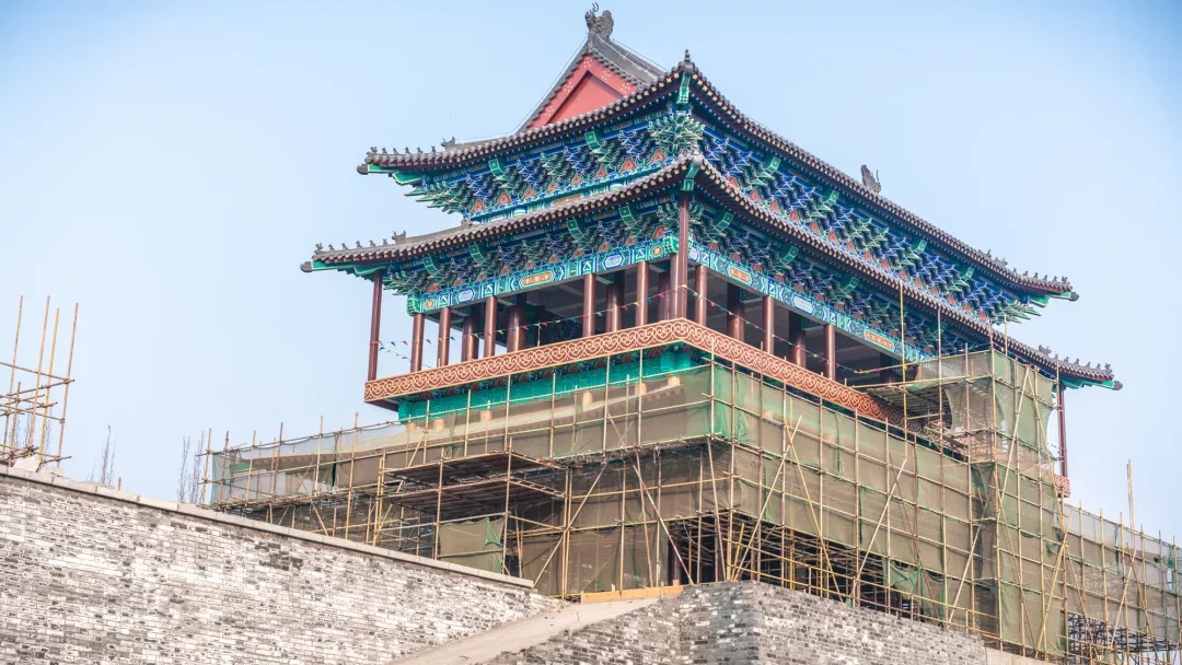 項目所有建筑中,最具標(biāo)志性的當(dāng)屬城門樓,同時,這也是項目內(nèi)工程量最大、工期最長的單體建筑。其中城墻高度為8.7米,城門樓最頂端高度為29.5米。僅城門樓施工使用的鋼管就已達(dá)20萬米,占整個項目鋼管消耗量的近一半,從基礎(chǔ)施工到主體完工,耗時近4個月。城門樓的彩繪部分采用的是旋子彩繪形式,用或圓潤飽滿、或流暢柔韌的各色線條旋轉(zhuǎn)盤結(jié)而成,最大的特點是在藻頭內(nèi)使用了帶卷渦紋的花瓣,旋子常用于殿式彩畫,既素雅又華美。