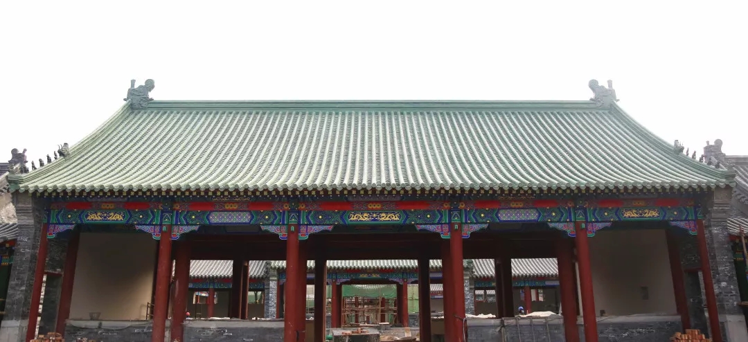 項目中仿古建筑的涂刷油漆部分做地仗都是采用“豬血+桐油”的古法油漆(“地仗”是一種采用“一麻五灰”的古老傳統(tǒng)工藝的施工做法)。仿古地仗油漆成活一般需要基層處理、下竹釘、捉縫灰、通灰、裹布等12道工序。清代彩繪的種類非常豐富,從紋飾的主體框架構(gòu)圖和題材方面分類可分五大類:和璽類、旋子類、蘇式類、海墁類和吉祥草類。“親王府”區(qū)域的建筑彩繪主要采用了三種繪畫形式,王府中軸線上建筑部分采用旋子墨線小點金彩繪,體現(xiàn)為輪廓線均用墨線,花心點金的形式;配房部分采用雅伍墨旋子彩繪,指完全不用金,線條用墨,旋子用藍(lán)、綠、白、黑四色,花瓣不起暈;長廊與園林部分的小型建筑部分采用蘇式彩繪,蘇式彩繪畫面內(nèi)容豐富,自然山水、花鳥魚蟲、各式人物一應(yīng)俱全。彩繪待地仗完成后還需依次為:丈量起譜子、刷生油、磨平、過水布、分中、打普子、瀝大小粉等13道工序。
