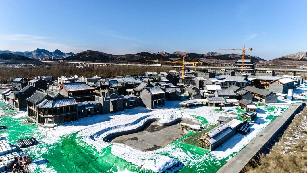 正在建設沖刺中的老濟南街,兼具明清與民國風情的各色建筑韻味初顯,親王府、城隍廟、城門樓、書院、醫院、警察局等各類建筑一目了然,園區氛圍日益濃厚起來,不久的將來,這些場景都將會出現在影視作品中。現場施工負責人表示,現場正在開足馬力搶工收尾,目前園區內共有500余名工人在不同區域,進行各個單體圍墻施工、管道及地面鋪裝、城墻砌筑與熱力等工作,確保4月15日項目主體工程竣工,達到可拍攝條件。