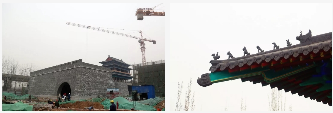 項目所有建筑中,城門樓是工程量最大、工期最長的單體建筑,其中,城墻全部采用手工磚砌筑,經過人工修整后的磚塊古樸素雅,并無過分雕飾痕跡。進入城門樓內部,柱與梁之間均為傳統木質斗拱支撐,城門樓的彩繪部分尤為明亮突出,采用的是旋子彩繪形式,一般經過6道工序,一平方米的彩繪需要一名繪畫師傅耗時約半天一次成型。
