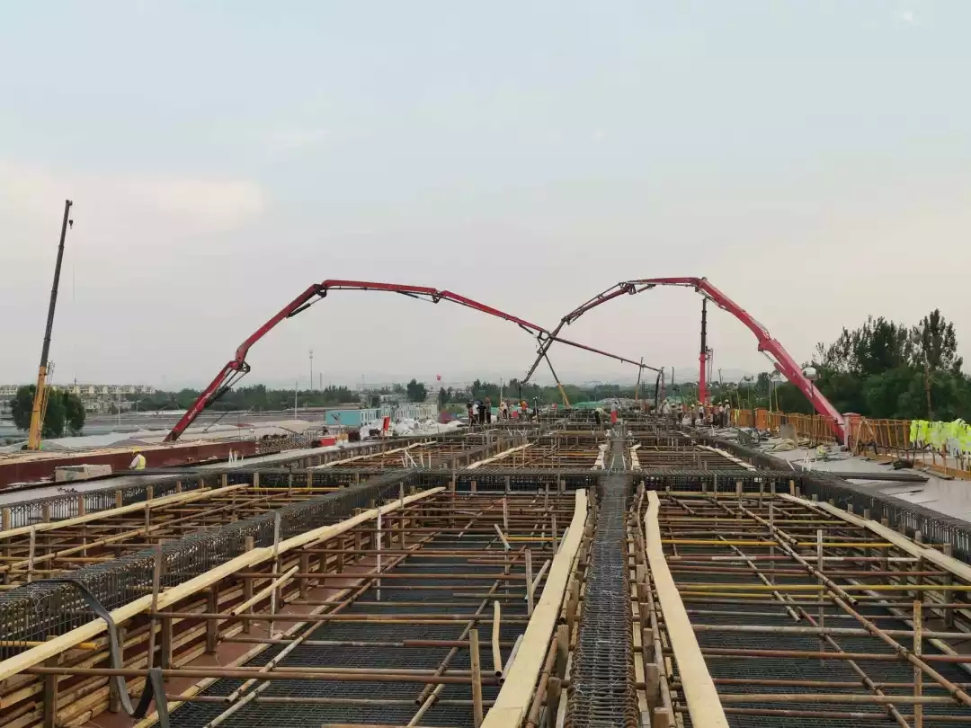 1號高架橋施工中,共投入5個施工隊伍、29個施工班組,870多名工人,采用平行、流水施工相結合及網絡計劃圖指導,進行有序、平衡、連續施工,統籌安排,做到“三早一快”即早進場、早安家設營、早開工、盡快形成大干局面。項目部倡導“嚴管就是厚愛”“今天再晚也是早、明天再早也是晚”的管理理念,嚴管管理人員、嚴控支架搭設、預應力張拉、波紋管定位、保護層控制、混凝土質量把控等關鍵環節。與征拆搶進度、與天氣搶進度、與施工環境搶進度,凝心聚力、攻堅克難,堅持奮戰221天,1號高架橋順利貫通!