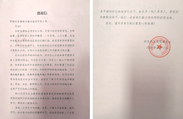 近日,一封來自槐蔭區(qū)段店社區(qū)居民委員會的感謝信發(fā)至濟南城市建設集團,感謝信的“主角”是集團所屬華誼兄弟(濟南)電影城投資開發(fā)有限公司的孫袖清同志。新型冠狀病毒肺炎疫情發(fā)生以來,孫袖清放棄春節(jié)假期和周末休息時間,個人主動聯(lián)系報名,積極參與社區(qū)疫情防控志愿服務工作,以實際行動彰顯黨員和建設集團人責任擔當,用無私奉獻展現(xiàn)一名“80后”的青春力量,與社區(qū)工作人員共同筑牢社區(qū)疫情防控安全線。