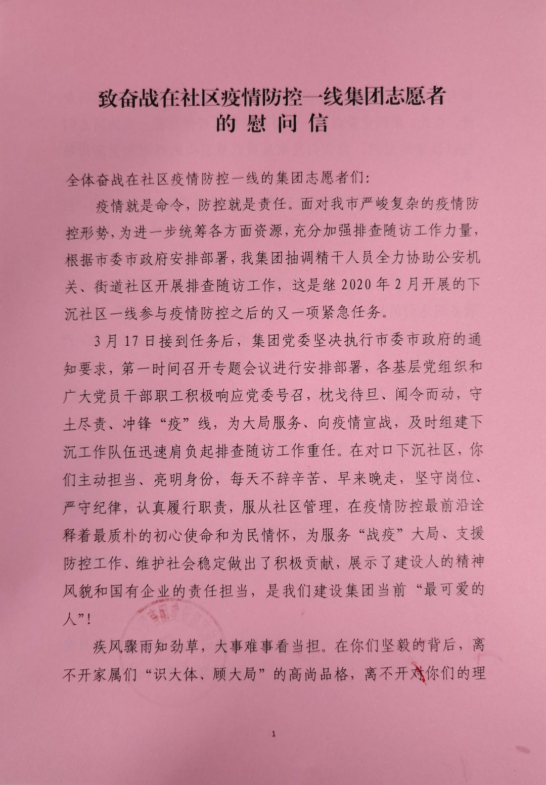 致奮戰在社區疫情防控一線集團志愿者的慰問信