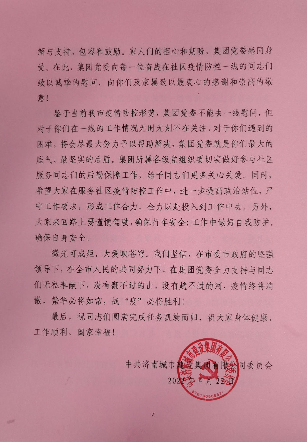 鑒于當前我市疫情防控形勢,集團黨委不能去一線慰問,但對于你們在一線的工作情況無時無刻不在關注,對于你們遇到的困難,將會盡最大努力予以幫助解決,集團黨委就是你們最大的底氣、最堅實的后盾。集團所屬各級黨組織要切實做好參與社區服務同志們的后勤保障工作,給予同志們更多關心關愛。同時,希望大家在服務社區疫情防控工作中,進一步提高政治站位,嚴守工作要求,形成工作合力,全力以赴投入到工作中去。另外,大家來回路上要謹慎駕駛,確保行車安全;工作中做好自我防護,確保自身安全。
