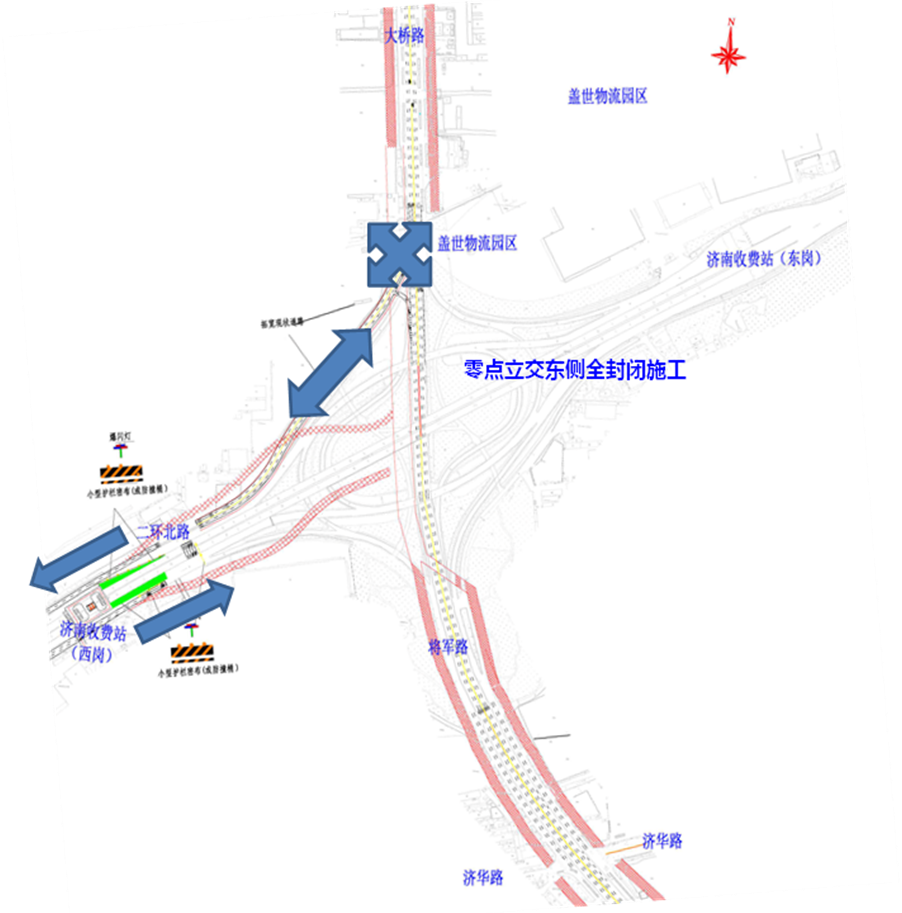 在此期間,零點立交橋下的大橋路南北向及G35濟廣高速主線東西向車輛正常通行。二環(huán)北路由西向東前往零點立交以北的左轉(zhuǎn)車輛,需通過零點立交橋西北象限擴建現(xiàn)狀道路與大橋路交叉口(現(xiàn)狀燈控口)進行交通轉(zhuǎn)換。其它車輛均需通過外圍相關(guān)道路繞行。
