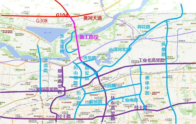 市區(qū)過路車輛可通過各城市快速路、干線道路繞行,經(jīng)濟濼路隧道、濟南黃河鳳凰大橋、濟南建邦黃河大橋等道路向北跨越黃河。