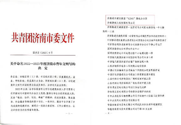 近日,共青團濟南市委印發了《關于命名2022-2023年度濟南市青年文明號的決定》,集團“12345”熱線辦公室、濟南新城文化傳媒有限公司兩家集體獲評2022-2023年度濟南市青年文明號。
