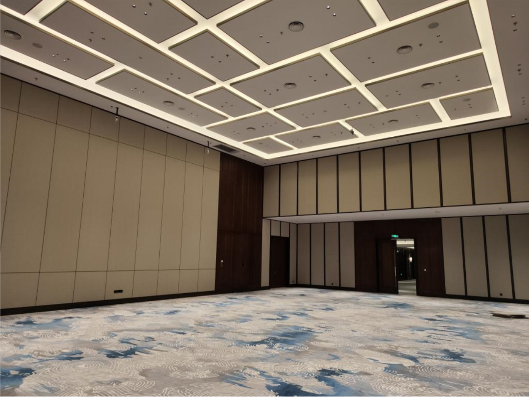 酒店大堂和過(guò)廳吊頂為異型鋁型材格柵吊頂,大宴會(huì)廳吊頂為多層鋁方通交錯(cuò)布置造型,項(xiàng)目團(tuán)隊(duì)使用BIM建模技術(shù),優(yōu)化施工工藝提高了施工效率,僅此一項(xiàng)節(jié)省工期30天,項(xiàng)目團(tuán)隊(duì)群策群力科學(xué)組織各項(xiàng)施工,7天完成地毯鋪裝18000平方米,10天完成墻面硬包安裝20000平方米,40天完成大理石鋪貼和干掛施工3.4萬(wàn)平方米,項(xiàng)目如期通過(guò)驗(yàn)收,為酒店開業(yè)奠定堅(jiān)實(shí)的基礎(chǔ)。