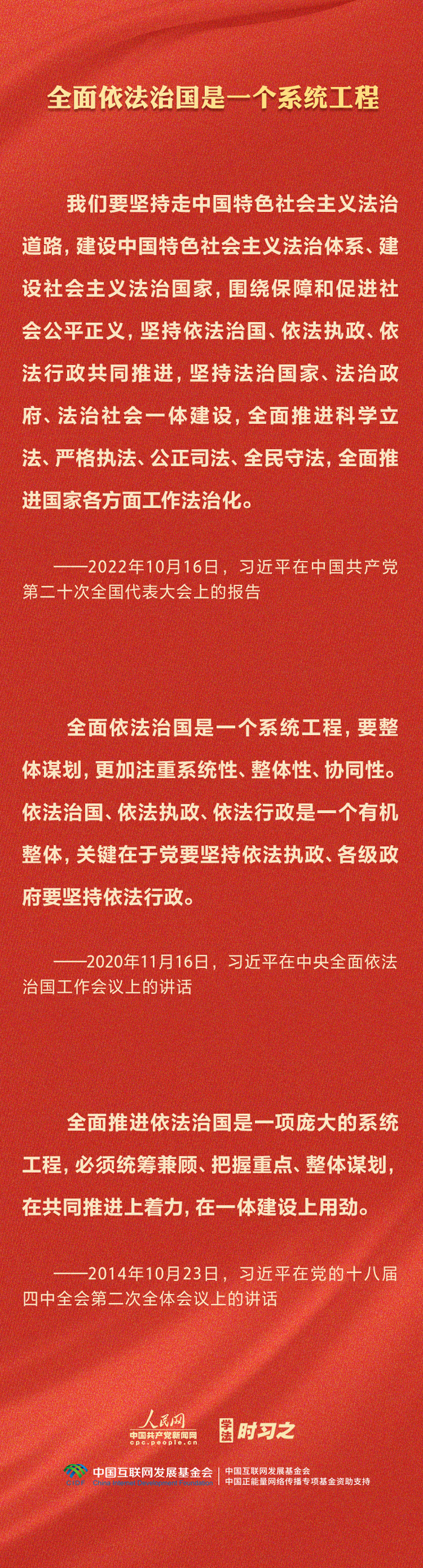 今年是貫徹落實黨的二十大精神的開局之年。中共中央政治局決定從今年4月開始,在全黨自上而下開展學習貫徹習近平新時代中國特色社會主義思想主題教育。習近平法治思想是習近平新時代中國特色社會主義思想的重要組成部分,人民網·中國共產黨新聞網推出學法時習之·學習習近平法治思想系列策劃,本篇聚焦“堅持依法治國、依法執政、依法行政共同推進,法治國家、法治政府、法治社會一體建設”。