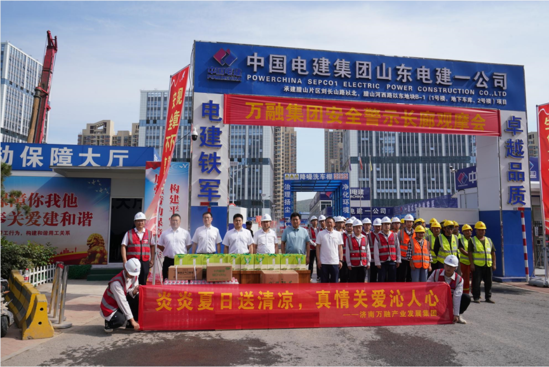 同時(shí),與會(huì)領(lǐng)導(dǎo)向一線建設(shè)者送上防暑降溫慰問(wèn)品。