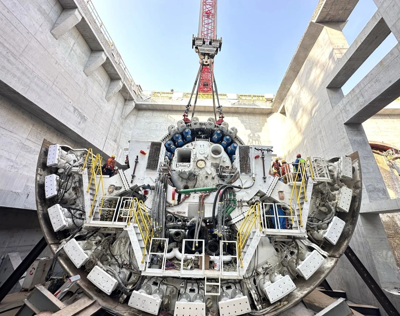 為了確保主驅(qū)動順利下井,項(xiàng)目團(tuán)隊(duì)科學(xué)部署、超前謀劃,多次研究施工現(xiàn)場,詳細(xì)制定主驅(qū)動吊裝下井方案,確保周圍環(huán)境符合施工要求。當(dāng)天上午,隨著指令下達(dá),800噸履帶吊將主驅(qū)動平穩(wěn)吊起,在空中經(jīng)歷了起吊、翻身、旋轉(zhuǎn)等一系列高難度動作后,經(jīng)過現(xiàn)場一點(diǎn)點(diǎn)調(diào)整方位后,緩緩送入始發(fā)井內(nèi),成功與井下盾體結(jié)合。