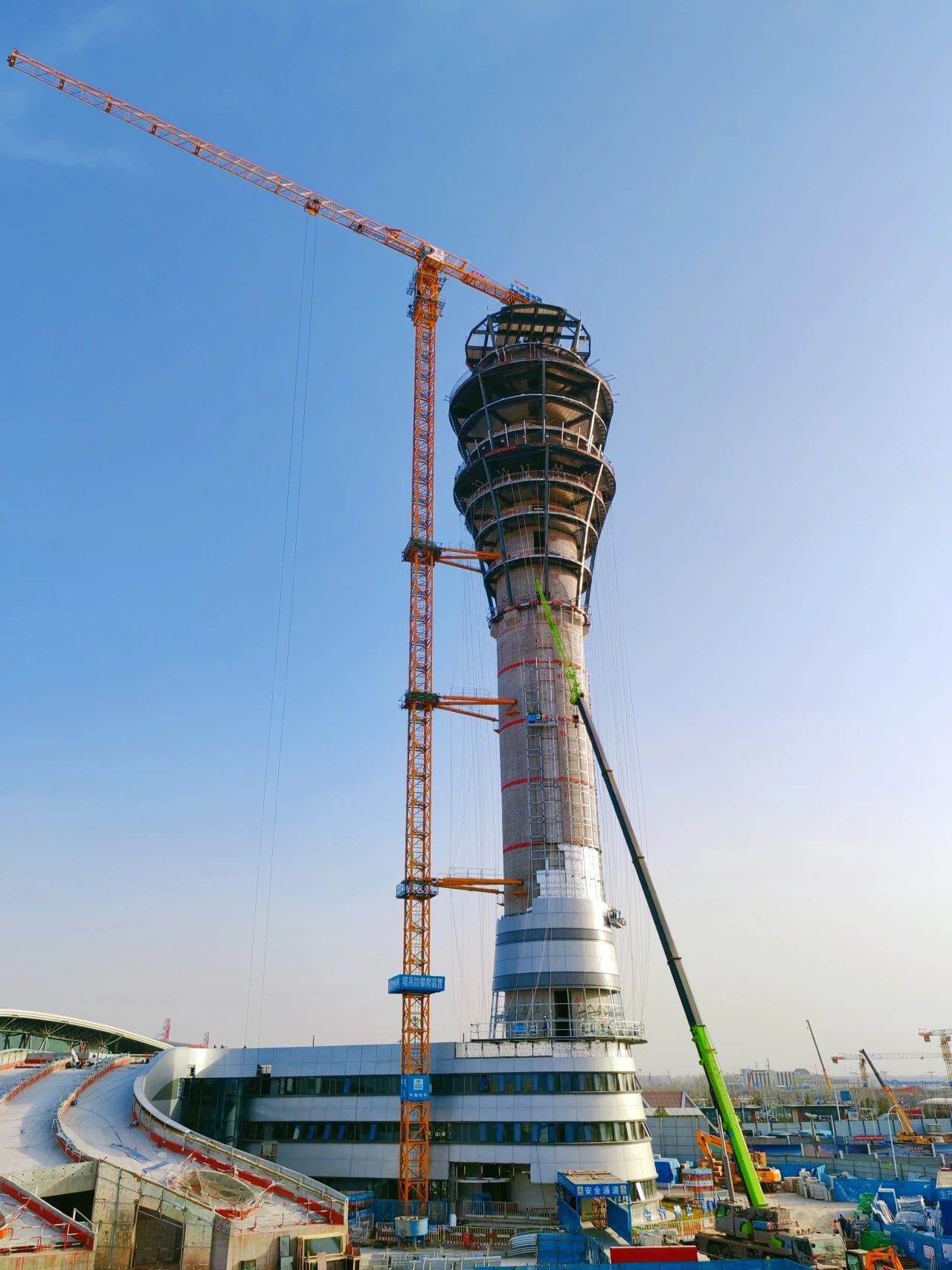 新建機場塔臺高度為99.5米,共19層,是國內第一個具備三層指揮層的塔臺。其中19層為指揮層,可俯瞰整座機場范圍,17層和16層是機坪指揮以及空管的應急指揮層。項目于2024年1月10日開工,2024年4月30日完成土方開挖,2024年6月5日完成結構正負零,2025年1月21日塔臺核心筒封頂,2025年3月19日完成筒外鋼結構吊裝。