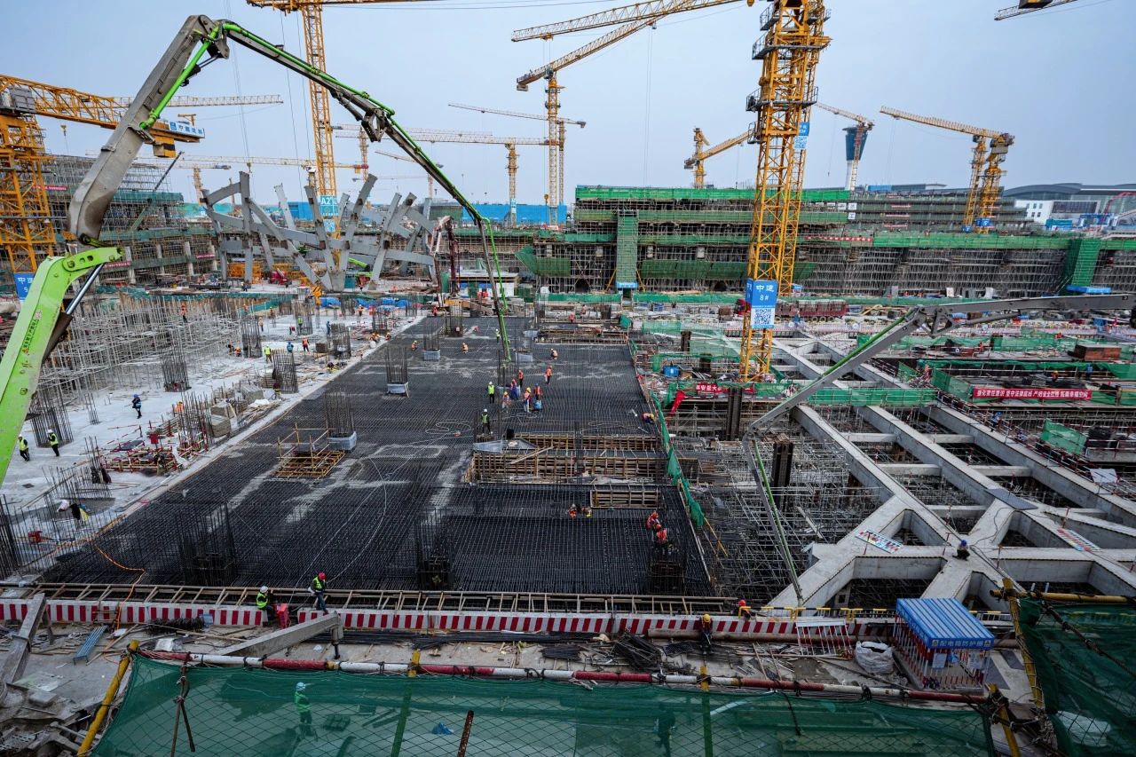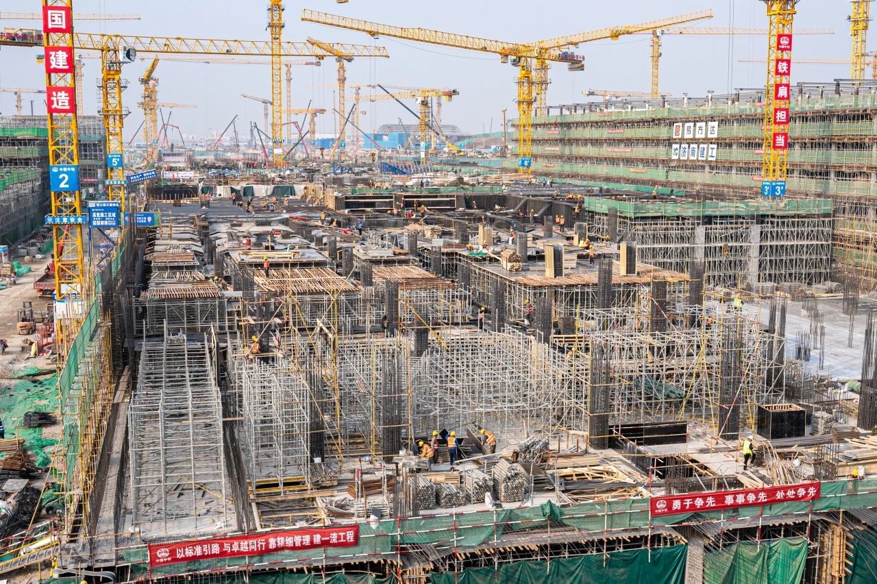在新建60萬㎡T2航站樓施工現場,項目A指廊正在進行樁基施工,B指廊正在進行地上結構施工,C指廊已完成主體結構封頂并正在進行鋼結構網架吊裝。主樓三、四區正在進行地下結構施工,主樓五區主體結構已施工至地上二層。