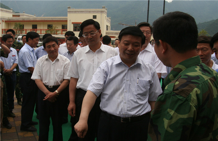 2008年6月,時任山東省委書記、省人大常委會主任姜異康(右一)到擂鼓鎮視察抗震救災工作